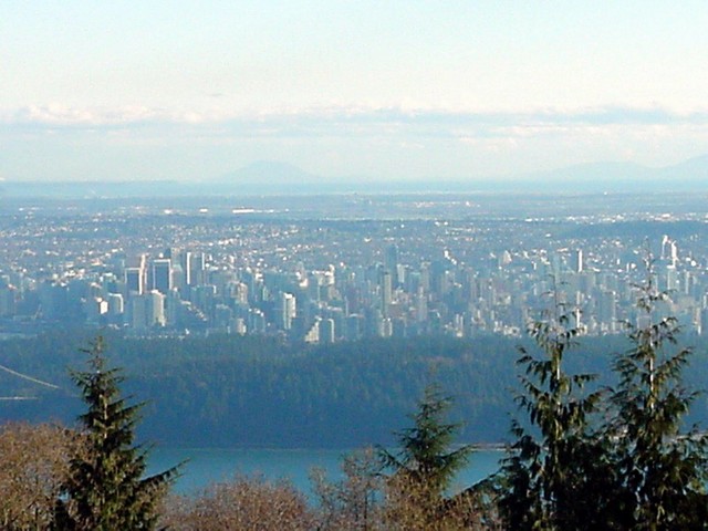 Gail drove up halfway the first of the three mountains that can be seen from the city, Cypress Mountain. At a lookout halfway I was offered this fantastic view over Greater Vancouver!