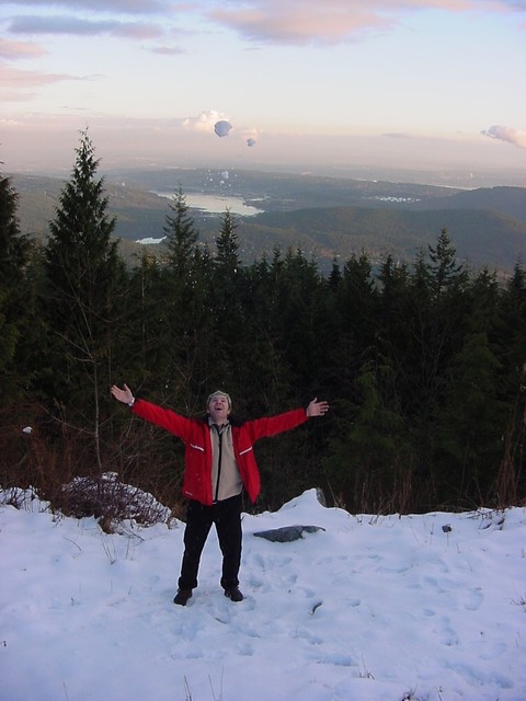Once at a lookout on Mount Seymour it was way colder than below and the extra fun part was: there was snow. There I was touching my first North American snow (and having a snowball fight with Gail). The sun was going down and coloured the sky purple. Oh, I’d never thought that it would end up as such a beautiful day when I woke up today with my bad hair day (photo) ;-) .